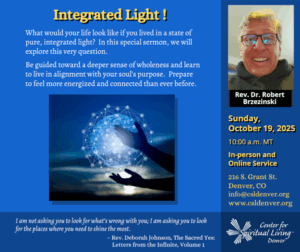 Please join CSL Denver this Sunday, October 19, as our good friend, Rev. Dr. Robert shares his thoughts on “Integrated Light!”