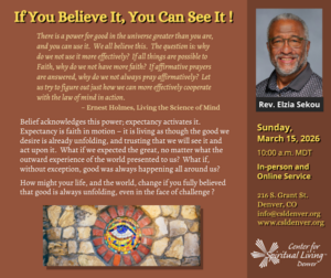 Please join CSL Denver this Sunday, March 15, as Rev. Elzia shares his thoughts on “If You Believe It, You Can See It!”